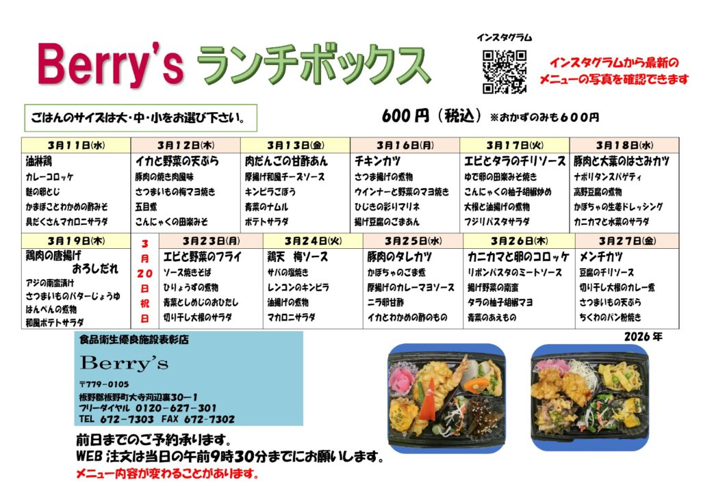 3月11日(水)~3月27日(金)までのメニュー表です。